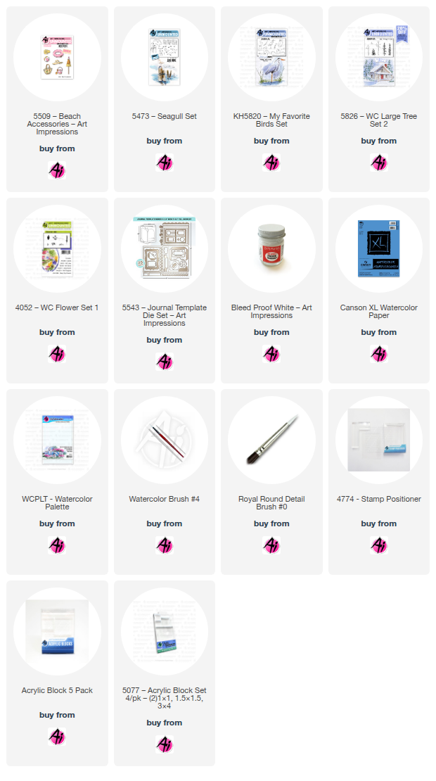 I feel so honored that Renee offered me the opportunity to be guest designer throughout the year now that Simone has moved to the Design Team. Simone does such an amazing job with her projects! I am a huge fan of Art Impressions and have been for years! I hope I can provide inspiration for you to use these amazing products. For this project, I cut out my rectangle with the die from the #5543 Journal Die set (2.75”x4”). I normally cut the project at the end, but I wanted this project to have a border. I then used my ruler to add a horizon line for the ocean approximately 1.25” from the top of the rectangle. I had stamped and cut masks for the beach ball and the tote bag from #5509 Beach Accessories, so I used them to determine where they should be stamped in the foreground. It helps to figure out placement before you start stamping. Once I had the masks in place, I added the dunes in pencil in the middle and then also drew the shoreline in pencil as a guide. My next step was to stamp the tote bag and beach ball. I started with the tote bag by inking it in #40 Brownish Grey so that I could avoid inking the tropical scene on bag. I then applied the mask and used my positioner to stamp the beach ball in Shadow Grey Archival ink so it looks like it is slightly behind the bag. With my positioner, I then added the seagull – also stamped in Shadow Grey Archival Ink. I still use Marvy Le Plume markers for my projects. Most of these can be converted to Tombow colors, but choose colors that work for you. These just happen to be some of my go-to colors for any project I work on.