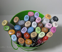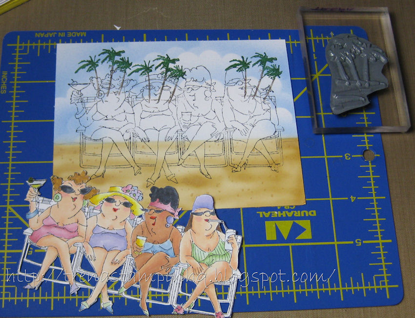 I colored the girls with Copics Markers and fussy cut them out. At this point I was not sure how much I wanted to cut away from the main image so I cut out around the whole thing. Remember, you can always cut more. Now, I have to admit... I have cut off a limb or two, and adhered them back together. Not very pretty. :o)