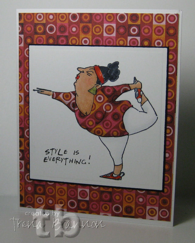 For my card today, I'm combing one of the new AI People images from the summer CHA release with Style. I just love this woman's confidence and poise. I think this sentiment captures her mood. :o) I stamped the image with Memento black ink onto Gina K Pure Luxury 120lb Heavy Base Weight Card Stock. I stamped her a second time onto design paper and cut out her leotard.