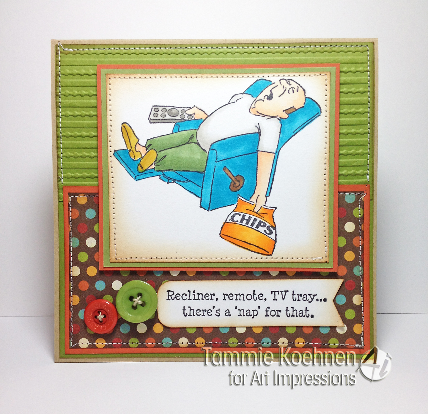 Hello Ai friends and happy Friday! I hope you had a great week, and are ready for the weekend. I've been a little short on masculine cards, so I thought I would make a couple so I have them handy. I chose to use this really fun Ai People stamp called Lazy Boy Set, SKU# 4159. It's a great stamp for a male birthday card, fathers day card, or any special card for the men in your life.