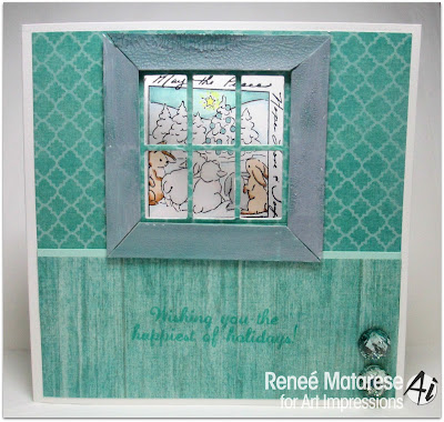 I found a cork circle in my stash and added it the watercolor panel, on top of the cork i added the paper pieced image. For a sentiment i added one in the bottom left corner, then added the panel to a black card base.