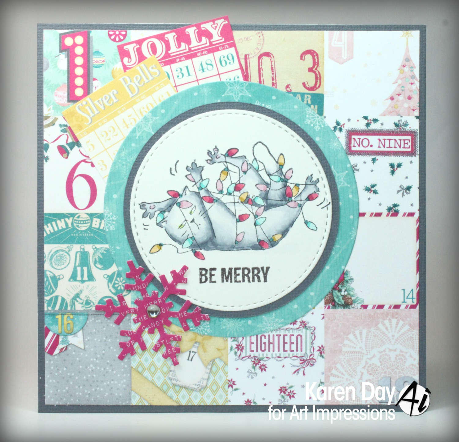 Of course, we have a fun background, right? I created to background with the watercolor set. The snow is done by stamping the snowflake background that also included in the set with chalk ink pad, and finished it up with some glimmer.
