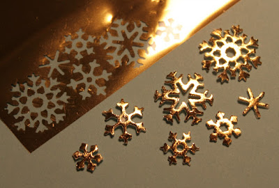 I flipped the foil over, and gently burnished the foil onto the snowflakes with my finger. Then I pulled off the foil and here are the results: