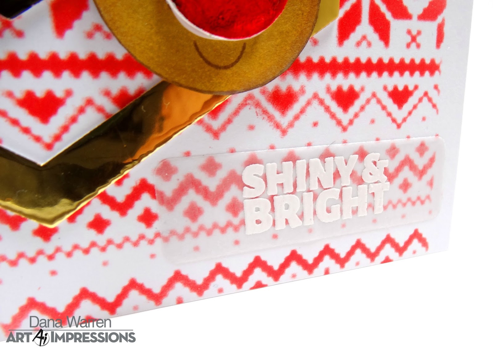 With some liquid adhesive, I added the Reindeer to my card on top of the Gold Chevrons. Next, I stamped the Shiny & Bright sentiment on vellum cardstock and then ran it through my sticker machine and added it to my card.