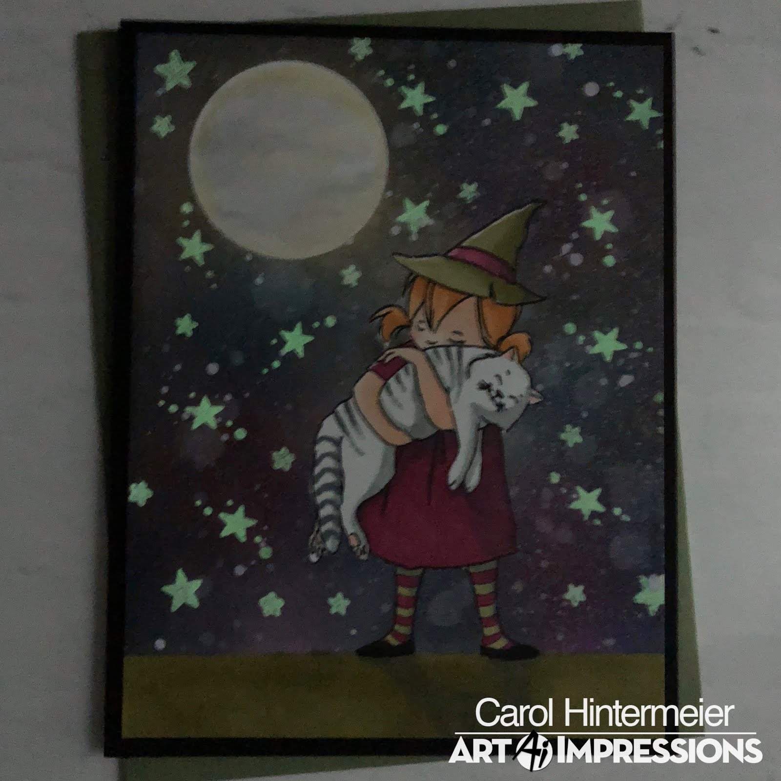 When the background was finished, I colored the moon by adding some scribbles of a Zig Clean Color marker in Fog Gray and smoothing it out with a damp brush. I put a bit of Fossilized Amber on my craft mat, and used my wet brush to add a diluted color around the edges of the moon and a bit here and there on the moon. I used alcohol markers to color the girl, cat and ground. (I added her shadow with a grey marker, then went over it all with the green.)