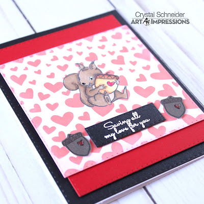 I die cut some solid red and black cardstock with the Rectangle Double Stitched dies and layered them under my image. As a last little detail I used a little clear Nuvo drops on the hearts to give them a little shine.
