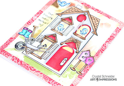 The first card I stamped the sentiment onto a banner and adhered it to the top right corner. I used floral pattern paper under the house it kind of looks like the house has wall paper inside.