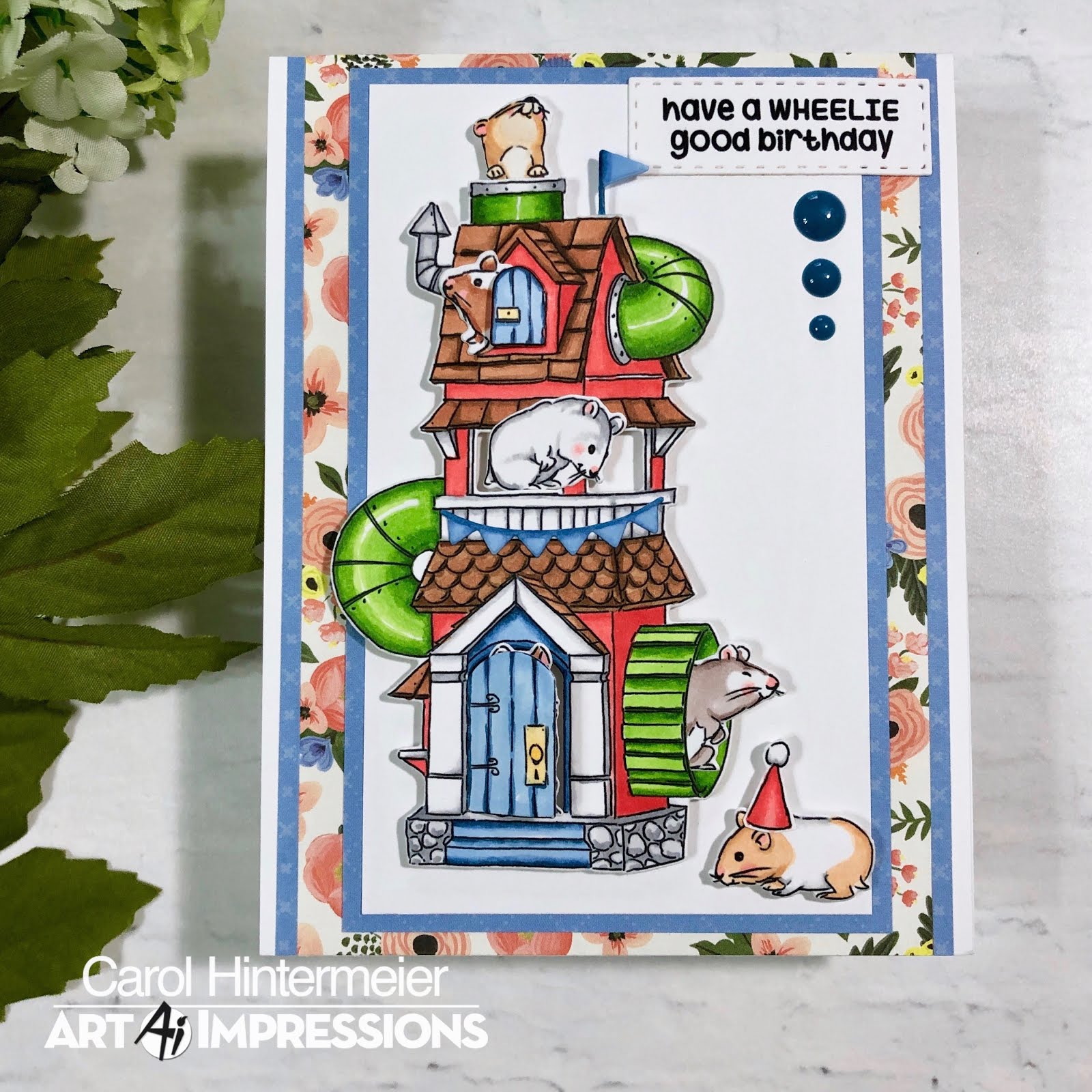 It's really fun playing with the little hamsters deciding which little opening to put them in!  Once I had them attached to the hamster house, I added foam tape to the back for dimension.  I attached it to the layered panel, which was adhered to an A2 top-fold card base.  I die cut the stamped sentiment with a Rectangle A2 Double Stitched die.  I added a few enamel dots near the sentiment.