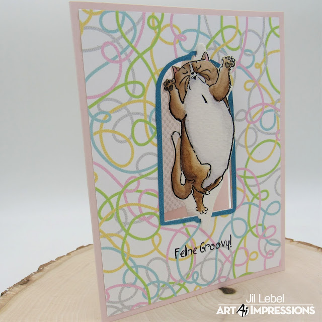 I cut a layer of Doodlebug Kitten Smitten 6" x 6" paper onto a white A2 card base with Stick It adhesive. Then I used the Twist Frame Set to cut an opening in my card. I then wanted to add a decorative frame with blue glitter paper. I used the Twist Frame Set to cut out the center of the glitter but left it in place. I traced around the outside of the frame with a pencil and cut it out before I attached it to my card. I stamped the Feline Groovy greeting with Versafine Clair Nocturne Ink and attached the cat image in my card.