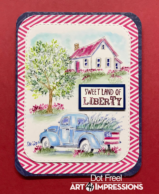 For the fireworks, I inked the long grasses from the Wagon Set in red and stamped it into the sky. I added a small amount of water. I added some red to the water and the roof of the house. Finally I added some blue to the sky. I made sure to bring my color out to the edge of the mask so it would create the oval shape.