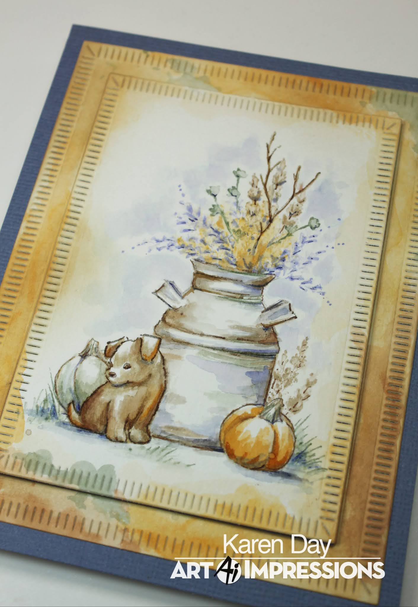 I painted in #565 as the sky colour, and added touches of 228/565/969 to the can, and added some 991 directly to the pumpkin as I wanted it to have some darker orange tones on the underside of it - then added a little to the puppy's coat as well. I used all of my colours to paint a multi-coloured edge to my scene, and then die cut it with two different rectangle dies which served to create a frame. I adhered the center piece with 3D adhesive to have it stand out a little from my slate blue cardstock base.