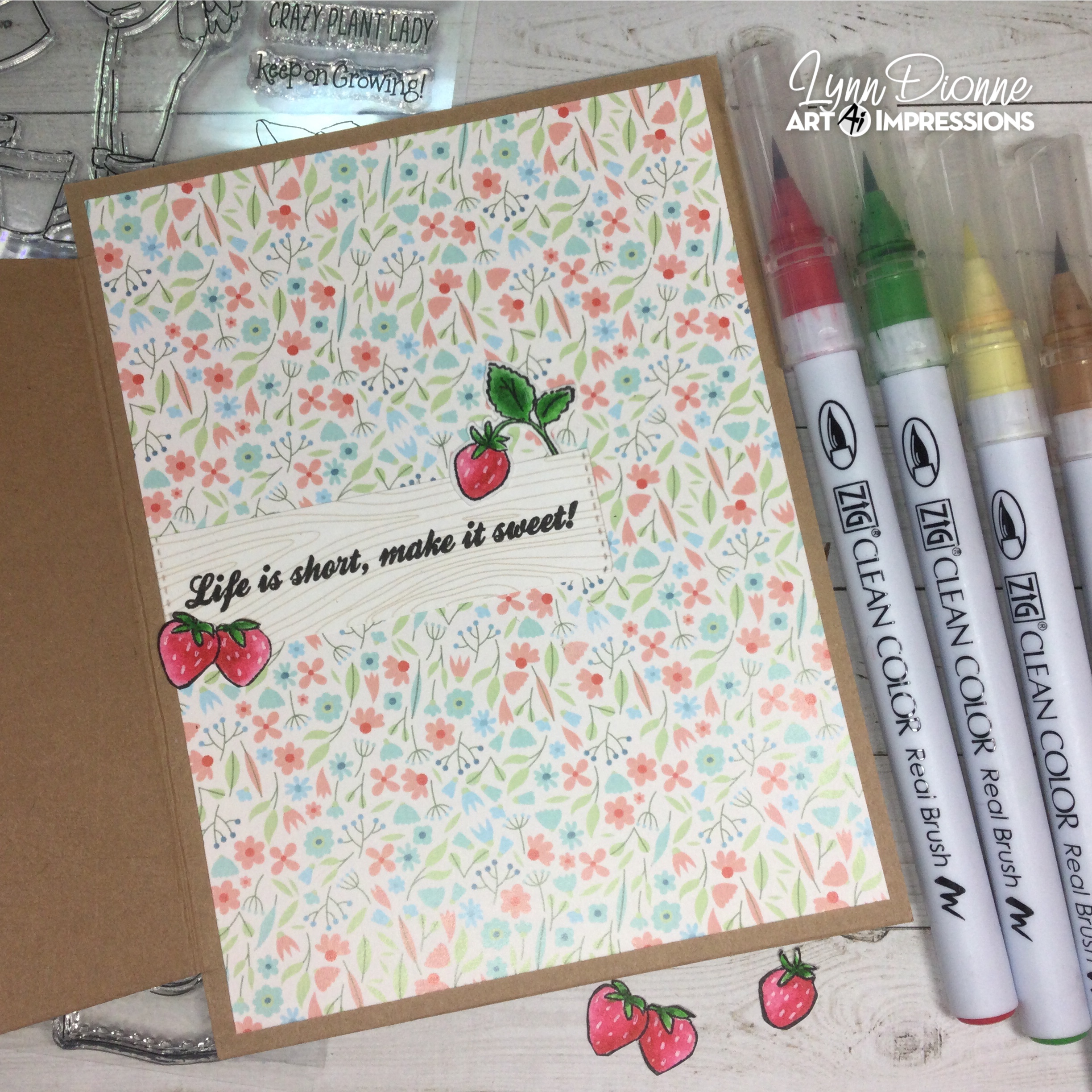 We will begin by stamping this little lady with the gardening pots and we will also stamp and color some strawberries from the Ai Berries Set (5795). Then we will be coloring all of the images with the Zig Clean Color Real Brush Pens in the following colors: Blender, Pale Yellow, Bright Yellow, Flesh Colour, Sugared Almond Pink, Geranium Red, Brown, Mid Brown, Beige, Blue Gray, May Green, Deep Green.