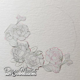 With all the flowers stamped and masks in place, I added extra leaves around the center flowers. I placed the vine wreath over the masked flowers, aligning with the pencil line, and inked in 969. Next, I used a damp brush to pull color from the lines of the flowers keeping in mind the direction of the light source for the shaded areas. For these small areas, I used a number 4 round brush and a number 0 round brush. I applied the same technique to the leaves and the vine wreath. To enhance the contours and shadows, I added more color from my palette as needed. For the leaves, I added highlights with 133. I darkened some of the areas of the flowers with 835. In areas of the flowers where I might have been a little heavy-handed, I used a small amount of our best friend, Dr. Ph. Martin’s Bleed Proof White, to add highlights. Next, I carefully painted in a dropped shadow along the wreath and flowers in N52. Using a Strawberry Red (75) TwinTone marker, I added dots to the flower centers and darkened some areas to enhance the details. I also used a brown TwinTone marker to add details to the vine wreath.