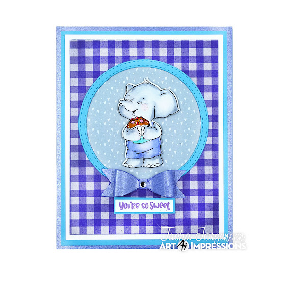 To coordinate with the colors used on the elephant, I added layers of purple, blue, gray, and white paper. The gray and white heart pattern paper adds color to the background, while allowing the elephant image to still be the main focus. Doesn't he look so happy with his sweet treat?