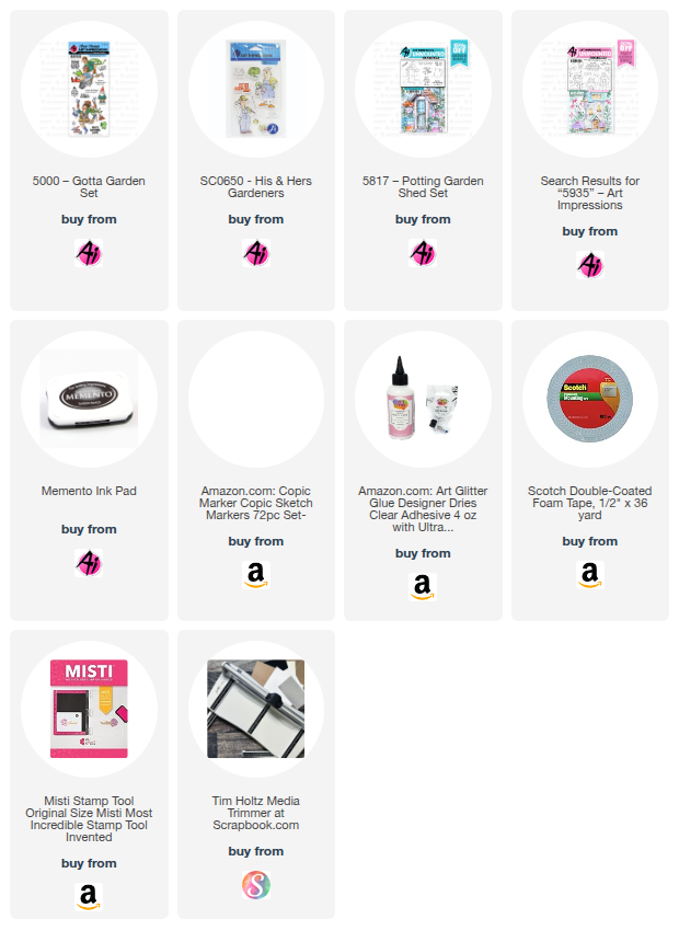 I started out by stamping the images onto copic friendly paper with Memento black ink and colored with copic markers listed below. I fussy cut the images. The garden shed is a watercolor stamp set and has a few garden pots at the base, so I just fussy cut them off and popped up the boots and garden hose over the cut area. I also cut an opening in the door and placed some tools and garden gloves inside. These accessories are from the #SC0650 - His & Hers Gardeners set. I also colored and cut some flowers from the #5935 - Fairytale Houses set.