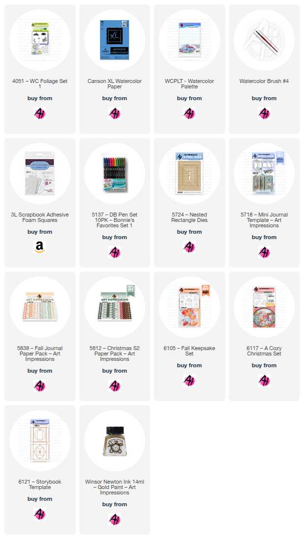 In addition to the stamp set, you need to purchase the 6121 - Storybook Template die. The die cuts out the box (at the top) and you cut three of the inner frame piece. The images were stamped on Mixed Media paper with #N55, and painted in with #349/993/493/837/N55, and a few touches of gold ink. Images were cut out using the coordinating dies that are included with the stamps.