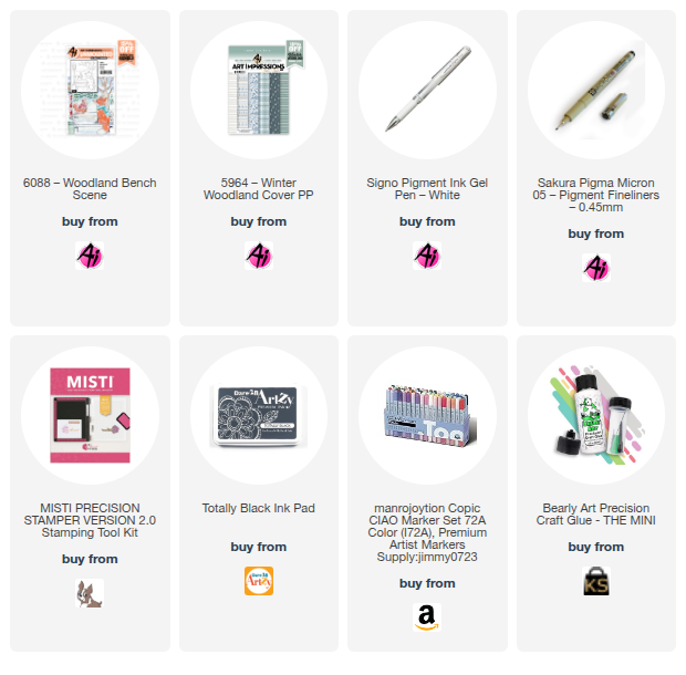 Tasha here sharing a card featuring the 6088-Woodland Bench Scene stamp. It has been snowing a lot where I live and the Winter weather inspired me to create a snowy little scene. These furry friends look happy enjoying the falling snow.