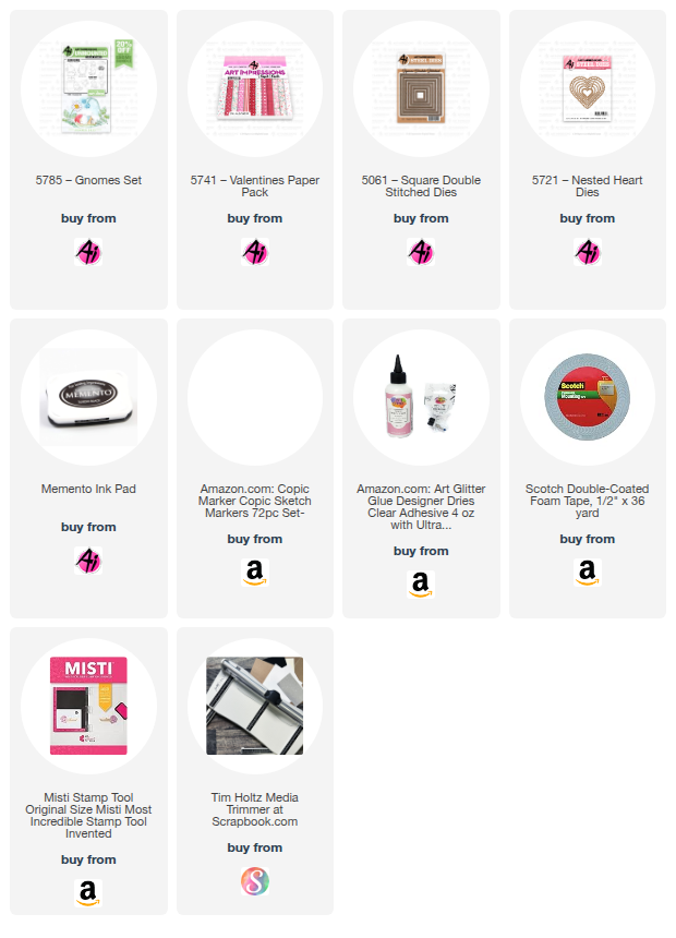 I created a standard A2 card using the #5741 - Valentine PP.   I also die cut 3 red panels using the stitched square dies #5061 and a square side-fold card from white cardstock, just slightly larger than one of the red panels to provide a border.  I positioned the smaller card to open from left to right and adhered the back side to the inside of the A2 card.  The right side of the smaller card will then close over the front of the A2 card.  I adhered a red panel to the front of the square card, one to the inside front and one to the front of the A2 card to be covered by the smaller card front.  I then decorated with the gnome images and the heart dies.  Placed a small white string bow on the front with a few scattered mini hearts to finalize the card.