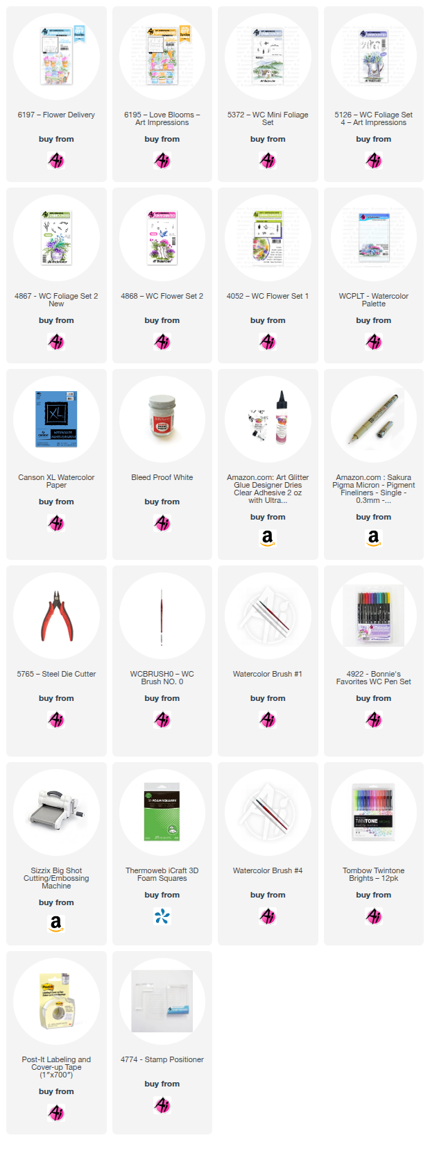Good morning, Watercolor friends! Spring has finally arrived here in Ohio! The new Spring Foundations stamp sets are perfect for creating spring-themed cards. Six new foundation sets are available, and they are fantastic because they provide a complete scene for you. Just add a few flower and foliage sets to craft a beautiful scene. For my first card, I used 6197-Flower Delivery, and for the second, 6195-Love Blooms. I used the same flowers and foliage on both cards, which are listed in the Linkdeli listing below. I began by coloring the stamps for the cards with Tombow 969 and 565, stamping off once.