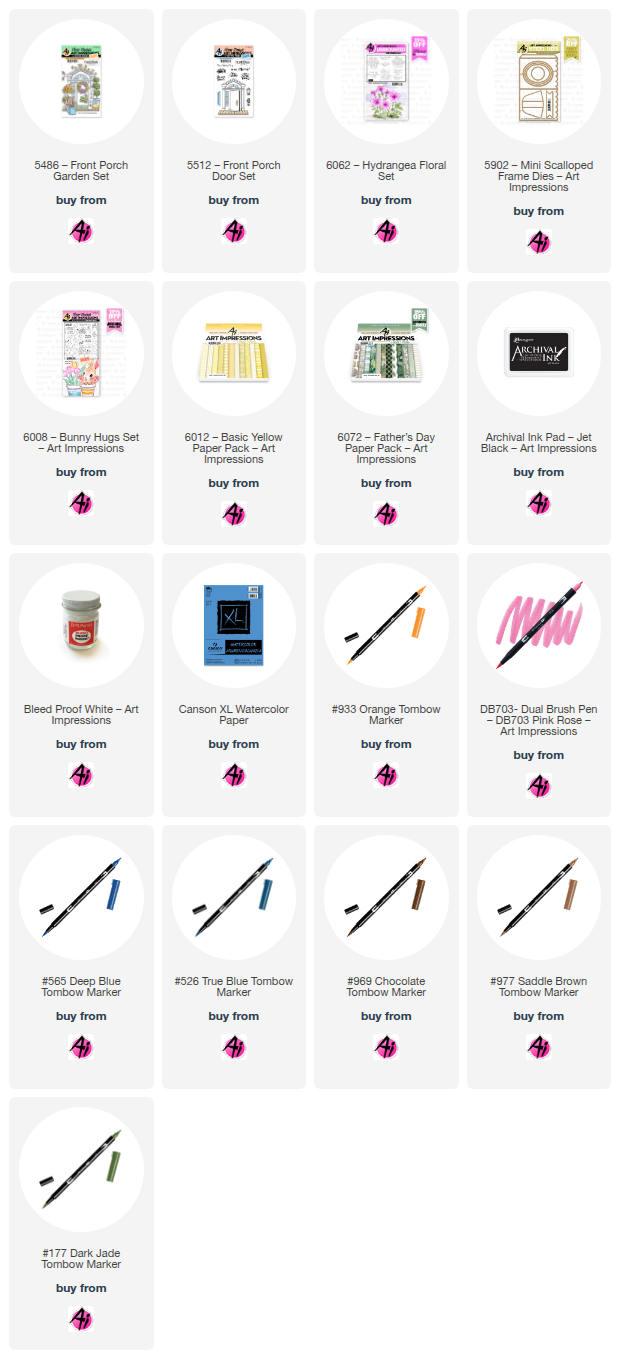 I love using the front porch sets, they are so easy to use. I just stamp, color, die cut, arrange and then attach with any adhesive handy. The stamp sets I used are 5486 and 5512 and the sentiment is from 6062. The Tombow pen colors I used are 177, 977, 969, 526, 703, 025 and 933. The brick paper is from the 6072 Father’s Day paper pack.