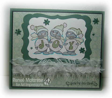 It's Crystal here , today with a heavy heart I am making my card for my last post with Ai , my term has come to an end and I must say good-by , I hope you have enjoyed my creations and will still come visit me on my blog www.8upscrapin.com ,come by and sign up with your email to keep seeing my posts . Today's card is a shaker card using Penguins , Sledding Penguins sku#Q3062 and Decorating penquins sku # T3055 and Merry Christmas sku#G4166 .