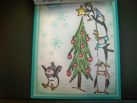inside my card I stamp the Merry Christmas then I mask it off and stamp my decorating penguins over it