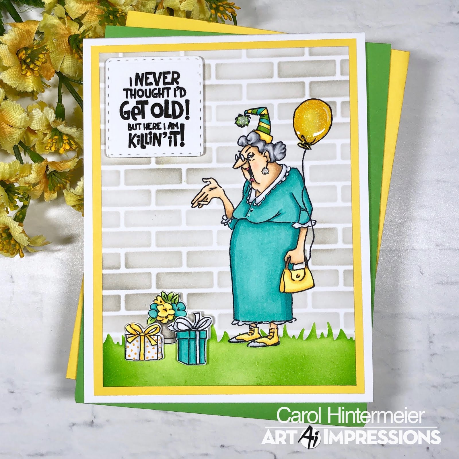 I stamped the image and the sentiments in Copic safe ink. I colored the ladies with the Copics listed below. I then used a Rectangle Double Stitched die to cut it out.