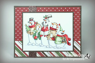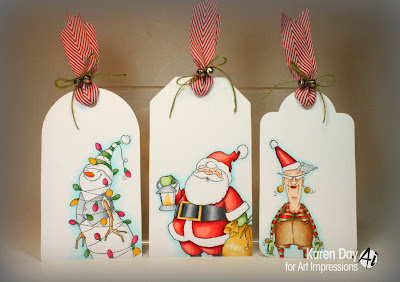 Well, it's present wrapping time in the Day household... so I've been making Christmas tags! I based my designs on an idea I saw on Pinterest, where the designer had stamped her images half off of the tag, and I really like the look. So I've used three of my favourite Art Impressions Christmas stamps, and this is what I came up with: