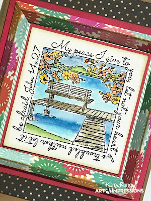 I first stamped the Eagle Window image with Gina K. Amalgam ink and colored it in with Copic markers, colors listed below. I used a Gelly Roll white pen to add a few highlights through out the image. This went really quick and I also used minimal markers. Images like these window stamps, are great for the summertime, when we might be a bit more busy. All of them are so picturesque, they can simply and easily be the focal point to any card front.