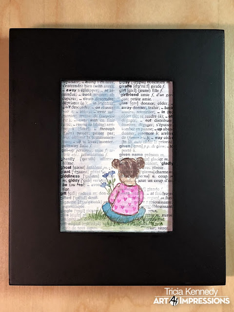 I made this card using Art Impression's stamps for the Watercolor Weekend. I stamped the little girl in 969 from the 5053 - WC Little Girls Set and stamped her off on a piece of scratch paper then stamped her on my watercolor paper. I used the stamp positioner to stamp the bench also in 969 from the 5055 - WC Sitting Places Set. I pulled the color out of the lines, then I watercolored the skin in with No. 47 pale pink, her cheeks in No. 55 iris purple, her hair in 969 and her overalls and headband in 603. I used 67 bubble gum pink to paint stripes on her shirt. I used 158 to watercolor the bench. Next, I stamped the umbrella in 969 from the 5118 - WC Beach Girls Set. I used a ruler and the Tombow twin tone brown fine tip pen to extend the umbrella pole under the bench. I pulled the color out of the lines then colored the umbrella in 158, bubble gum pink and 636. I stamped the small grass with 177 from the 4052 - WC Foliage Set 1 and pulled the color out and up. Then I stamped the flowers in 177, 636 and 55 iris purple from the 4868 - WC Flower Set 2. I used 565 to watercolor the sky and add some shadows under the bench. I used the 5062 - Rounded Rectangle A2 Double Stitched Dies to cut out the scene and background pieces then adhered them all to a card base with double sided tape. I added my name and date to the corner and drew the eyelash with a very fine black pen.
