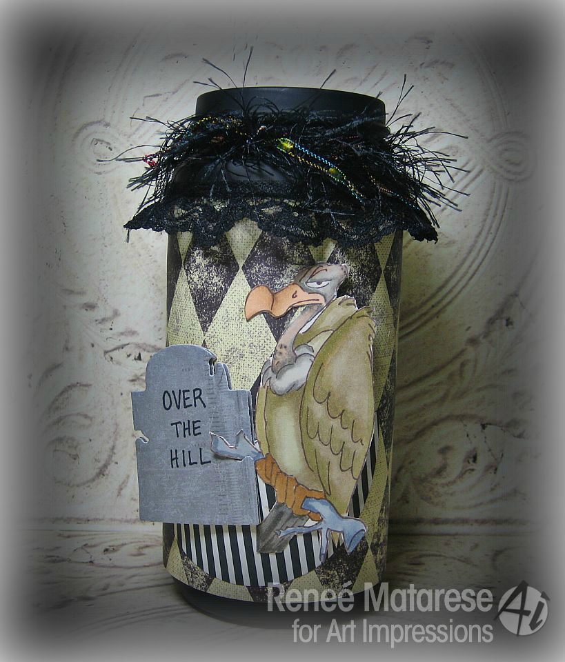Next I added the buzzard and a tombstone from Sizzix. Last, I added the black lace and fuzzy ribbon. I thought the ribbon looked "feathery".