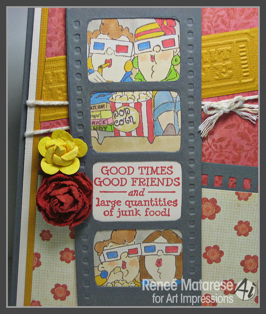 At the Movies card. This time I stamped the image several times and cut the pieces to fit inside a filmstrip embossing folder that I have.