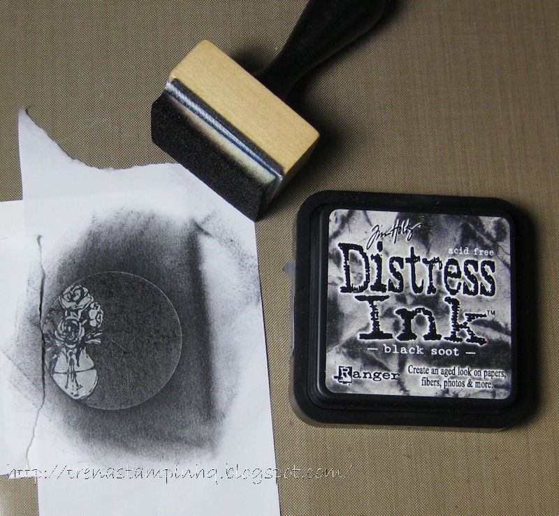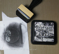 Next I used Eclipse tape to mask, and used a blending tool with a black soot Distress Ink pad to create a dark circle with the image at the edge of it.