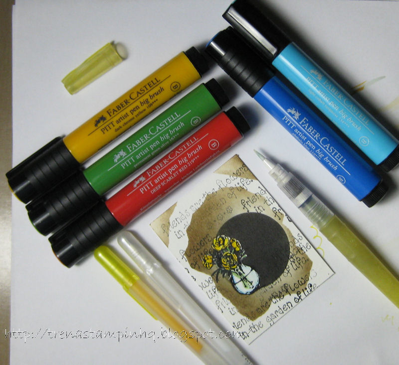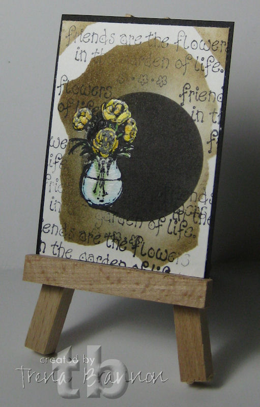 I then inked up the Friends are Flowers sentiment, stamped off on scratch paper and stamped onto the ATC. Repeated several times to create a 'word background.' To create the white boarder, I ripped the masking tape and placed around the image and circle. I used the blending tool and a walnut stain Distress Ink pad to add a little color.