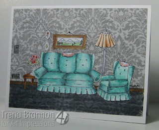 List of Supplies Used: Stamps - living room # T1347Paper - X-pressNeenah Solar White,  Basic Grey design paperColoring Copic Markers 0, B91,  C1, C3, C5, C7,  BG11, BG13, BG18, E000, E02, E17, E33, E35, G40, G82, R21, R24, Y13, YG05- ; Ink  Memento Black ink pad,  Copic Markers multiliner 0.03Accessories - fabric, alcohol
