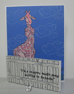 Today my Ai Zoo Crew giraffe sku #4190 friend has his head in the clouds , when I received this new stamp I was so excited, I love the tall elegance of a giraffe not to mention the long batty eyelashes .I kept this card kind of simple, I used Kraft card stock as my base A2 card and the layer is Kraft also , I ran it thru the Tim Holtz wood-grain embossing folder then tore the outer edges and the sponged SU soft sued ink around the edges and over the entire layer to bring out the wood grain next I zigzag stitched this layer on the front , my clouds are from a sizzix die cut from SU pool party card stock sponged in SU pool party ink and the used pool party marker to make faux stitch lines on them I added the ribbon to the card and then popped up the clouds on foam tape , I placed the clouds and trimmed off the over hang , I then stamped my giraffe on SU Naturals ivory card stock and with brown memento ink and colored him with my copic markers and then fussy cut him out and popped him up on foam tape , I then made a banner to stamp my sentiment that came with my set and faux stitched it with a brown sharpie, I love that Ai sells stamp sets , images with the sentiment that go perfect with them.