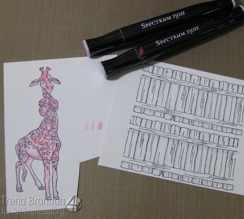 next I color inside ears and down nose with RV10 and then color entire image with Y21 and blend over entire giraffe