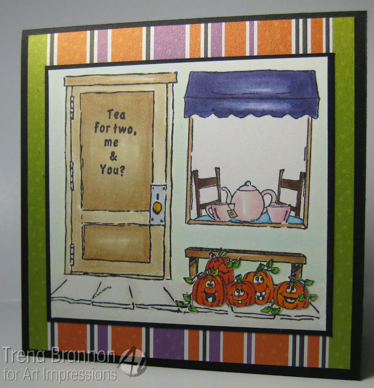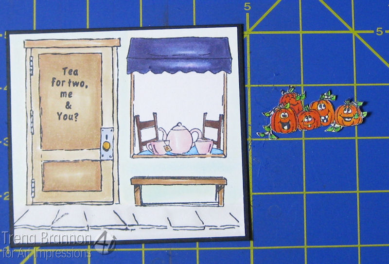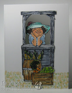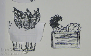 I used the black marker to edge around the inside of the hole. Next I placed Sarah. I added adhesive to her hat, face and shoulders, leaving her elbows free. I used liquid glue to place her behind her stand, so I could get her just right before pressing down. For Sarah's produce, I stamped the barrel and crate first, masked the tops and stamped the veggies. I colored them and cut them out.