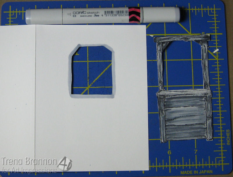 Since Sarah's back is the larger piece, I arranged the inside first. I used a light pencil mark to show me where the back side of the stand should be placed. After adhering the stand inside, I used the craft knife to cut out the window.
