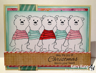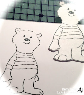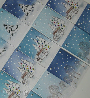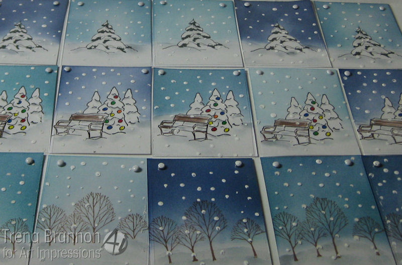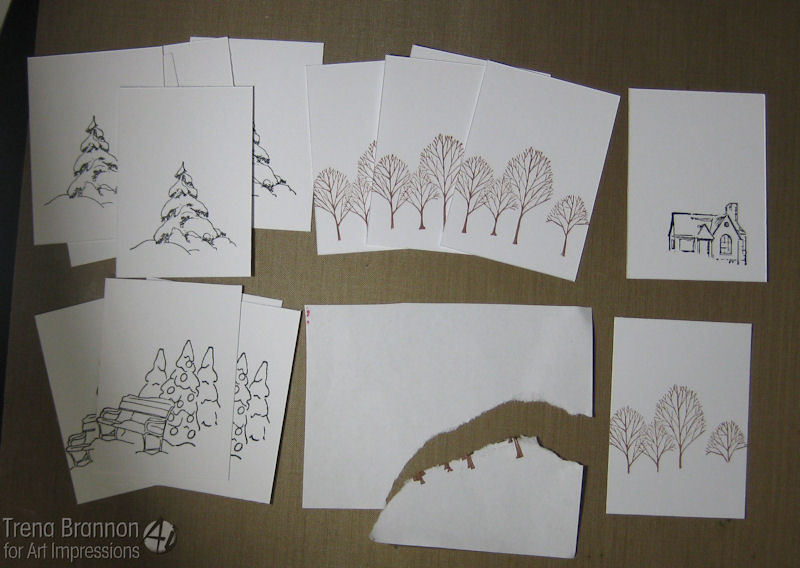 I tore a mask from scrap paper to create a top and bottom. I then inked up the images and stamped onto white cardstock. I used the bottom mask piece for the trees and house to mask space for the snow drifts.