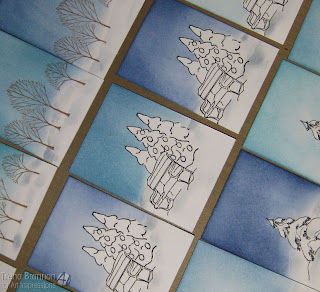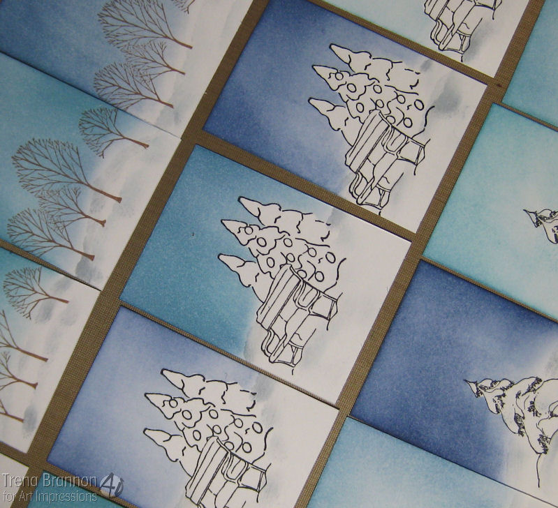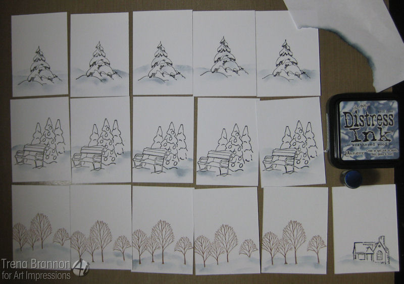 For the next step, I added color to the sky with a blending tool and distress ink. I find when I use a light touch in circles from the outside in, I can get a nice blend as I build the color. I also like to leave a little light in my sky - not completely fill in with the same amount of color. I created a variety of day time and night time skies.