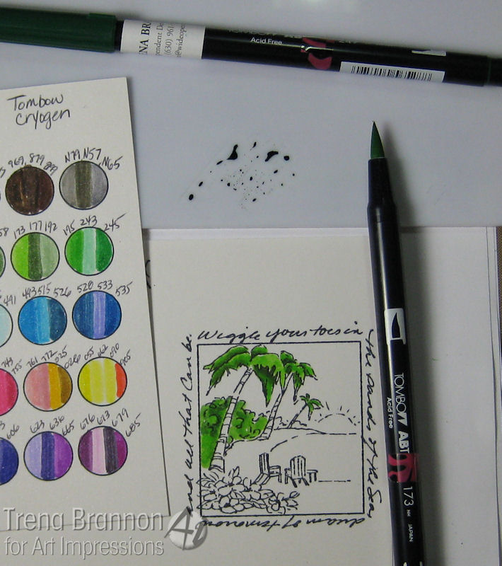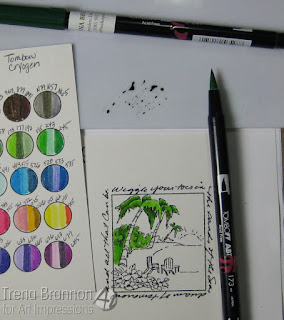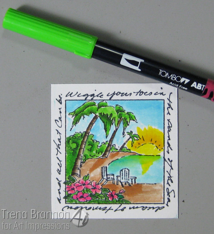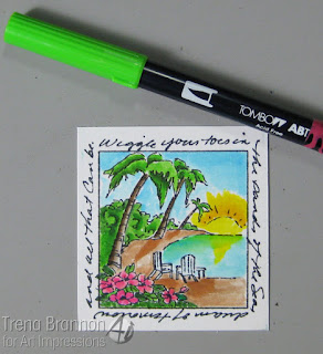 Now, to share what I made!! I know what you're thinking - that doesn't look like a graduation card. When you read the words on Island Window (Sku#M3178), you see that it is - Wiggle your toes in the sands of the Sea, dream of tomorrow and all that can be. I love those words! A dream is where it all starts - our ambitions, the choices that we make - they are driven by our dreams and that's why I dig this image for a graduation card! To color this image, I chose Tombow Dual Brush pens. They work great on smooth coated card stock.