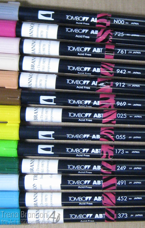 I love the bright colors of the image at the Ai website and used it as a color guide. Using the guide and the color chart I created with the dual brush pens on Cryogen cardstock, I jumped into coloring. I colored direct to paper and also used a palette to achieve a smooth blending of colors. For palette blending, I scribbled a brush pen of darker value down and picked up color with a pen of lighter value.